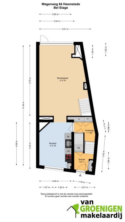 BEL-ETAGE: entree, keuken met divers inbouwapparatuur, woonkamer met deur naar de achtertuin en een trap naar het souterrain.