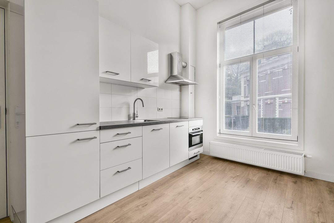 BEL-ETAGE: entree, keuken met divers inbouwapparatuur, woonkamer met deur naar de achtertuin en een trap naar het souterrain.