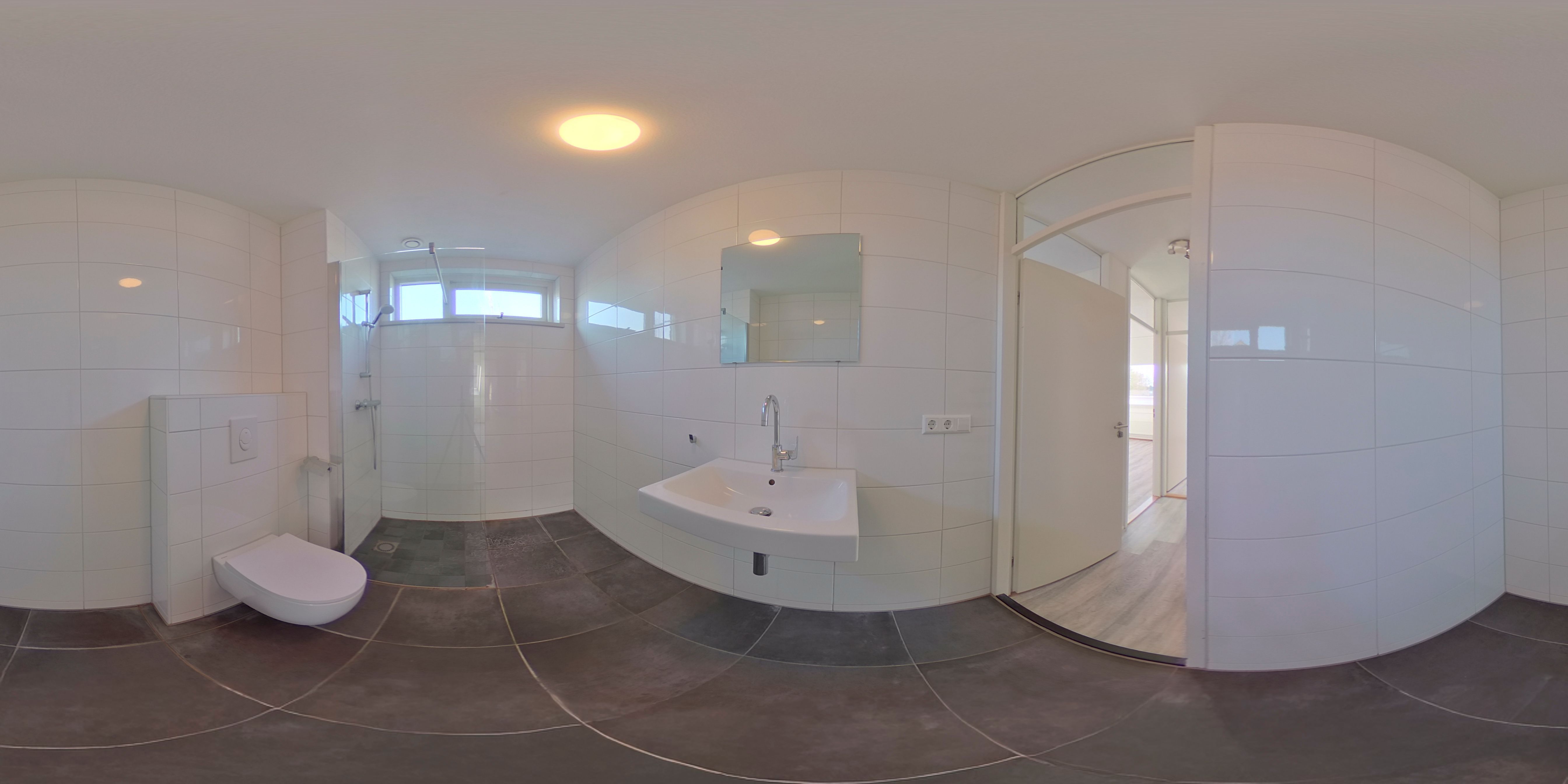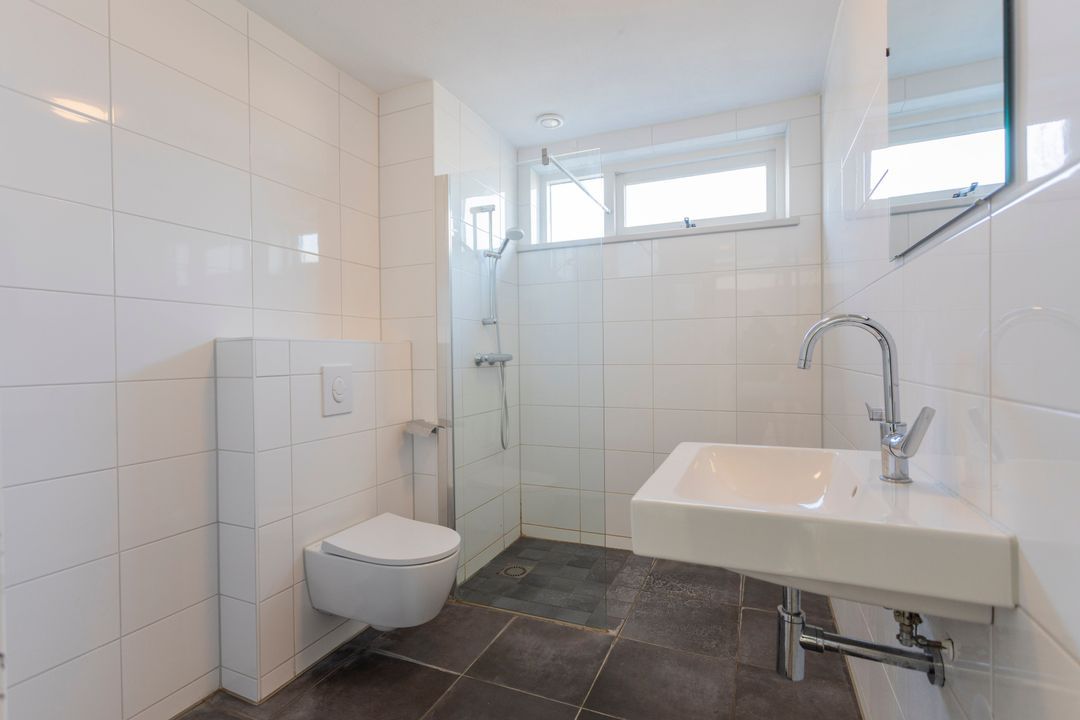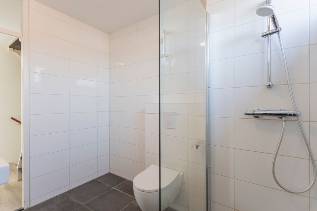 1e VERDIEPING: overloop, 3 slaapkamers, royale badkamer met douche, toilet, wastafel en wasmachine aansluiting, vaste trap naar