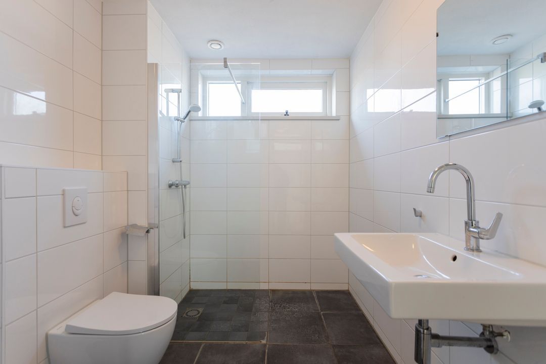 1e VERDIEPING: overloop, 3 slaapkamers, royale badkamer met douche, toilet, wastafel en wasmachine aansluiting, vaste trap naar