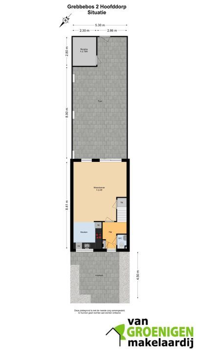 Entrance hall, meter cupboard, toilet with washbasin, garden-facing living room with sliding doors to the garden, under-stairs storage cupboard, and an open-plan kitchen at the front of the house.