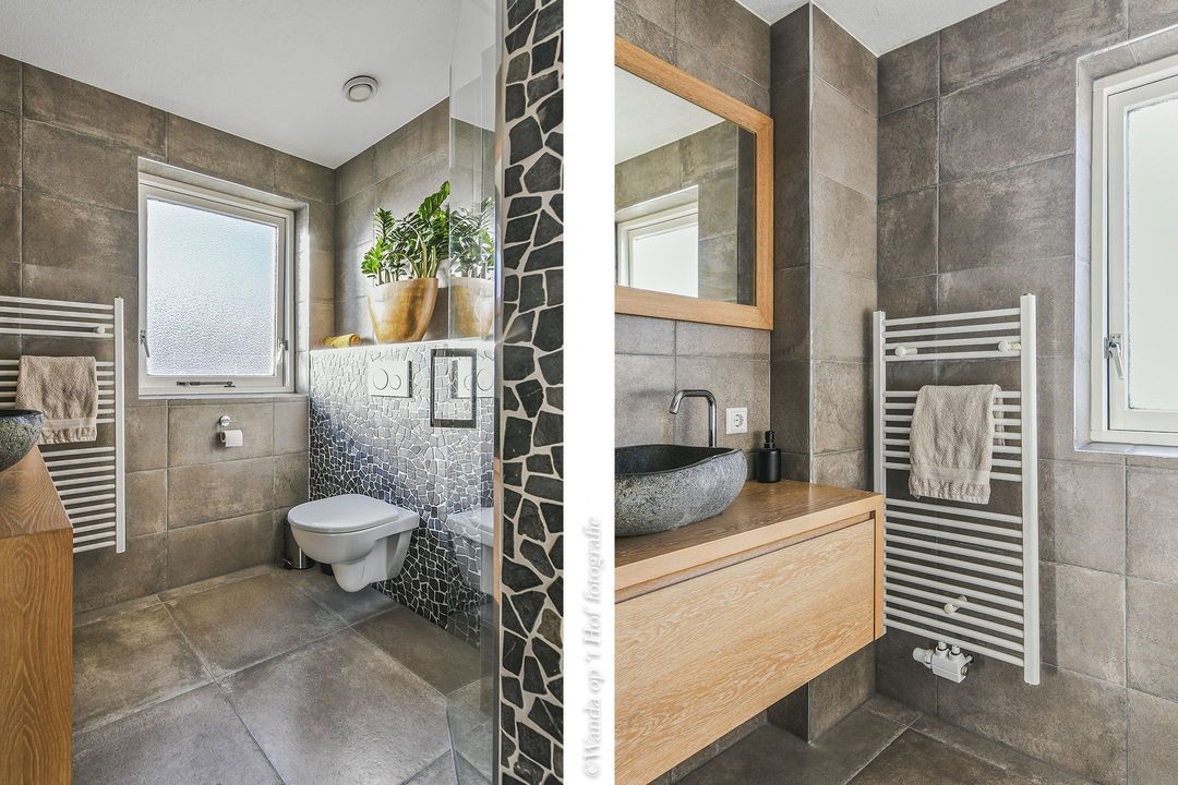 1e VERDIEPING: overloop met C.V.-kast, drie slaapkamers en een moderne badkamer met inloopdouche, wastafel en tweede toilet. Vaste trap naar de tweede verdieping.