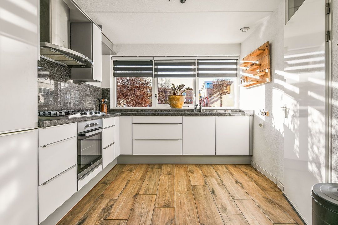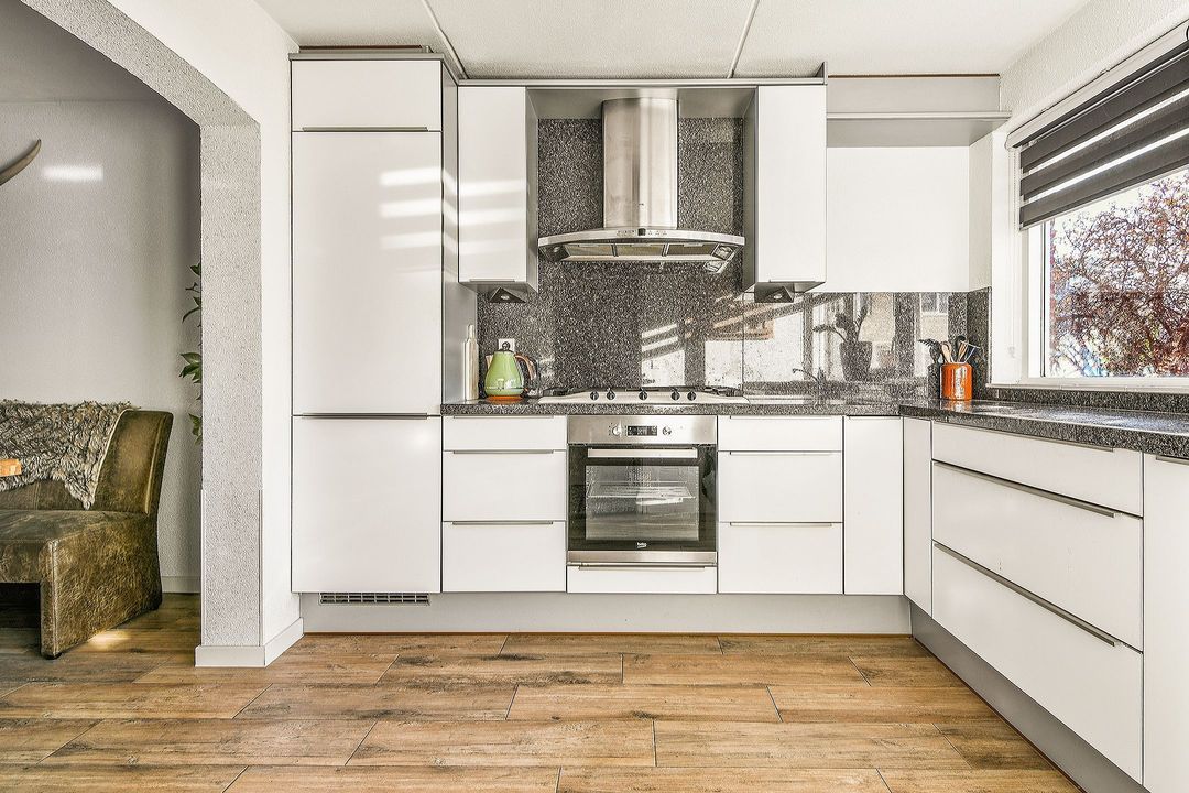 BEGANE GROND: entree met meterkast en toilet. Tuingerichte woonkamer met trapkast. Aan de voorzijde bevindt zich de moderne keuken, voorzien van diverse inbouwapparatuur zoals een gaskookplaat, oven, koelkast, vriezer, vaatwasser en een RVS afzuigkap.