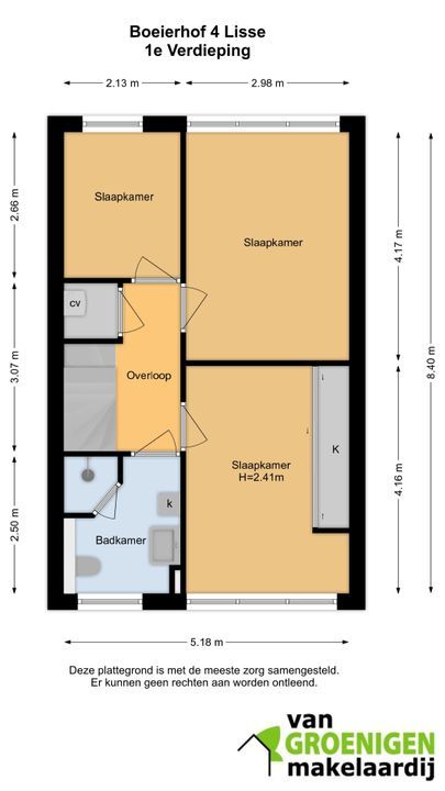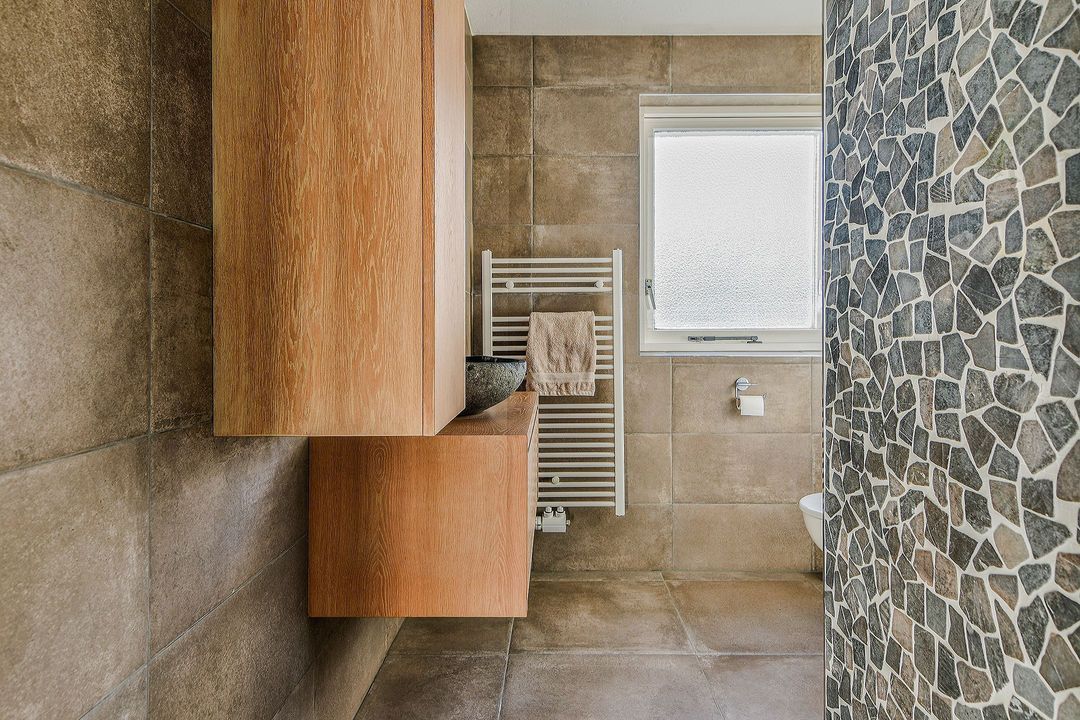 1e VERDIEPING: overloop met C.V.-kast, drie slaapkamers en een moderne badkamer met inloopdouche, wastafel en tweede toilet. Vaste trap naar de tweede verdieping.